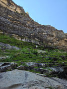 At the 4.5mi mark you'll see the "Lone Boulder" while standing in a huge boulder field and will need to decide if you want to go the slab route (down canyon left) or the gully route (down canyon right). The group needs to have consensus on what everyone is most comfortable doing. You don't want to be on a slab and freeze up or freak out. There are many reported deaths in this canyon, some of them from the slab. Slab route is supposedly faster and more direct. Our group opted for the gully route but it is substantially longer and involves some elevation gain. This isn't to say that the gully route is completely safe. It does involve traversing some no-fall slab zones and the gully itself involves downclimbing boulders that everyone will need to be comfortable with. The gully in punishing and slow going. Its not exactly a clear route as to which way you should go. You're route finding every move. It's also fully exposed once the sun crests the canyon. We didn't finish the gully section until around 1:00pm. It was still another mile of boulder field to meet up with where the slab route comes down. There is a nice swimming hole at this junction however we did not have the time to partake. Once the gully route joins back up with where the slab route ends, there is still another mile to go following the creek across rocks and dense brush and boulder fields until you reach the rappels.